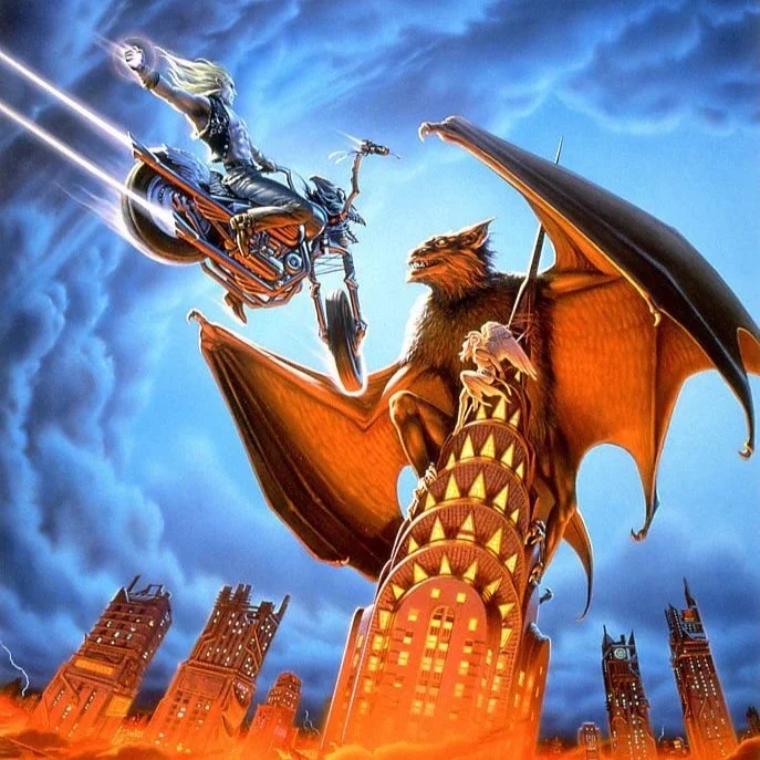 You might be thinking, why Bat Out of Hell II when the first one’s right there? Honestly, I just prefer the composition of the second. The angle, looking up at the bat on top of the Chrysler building, gives it such an intimidating feel. I also love the motion in this piece, the motorcyclist sweeping in from the top left adds so much energy. The colours are really nicely balanced too: that burning orange city fading into the clear, electric blue sky is a great way of showing the contrast between heaven and hell. Overall, it’s such a bold, dramatic image, perfectly in line with the sheer theatrical madness of Meat Loaf and Jim Steinman’s music.